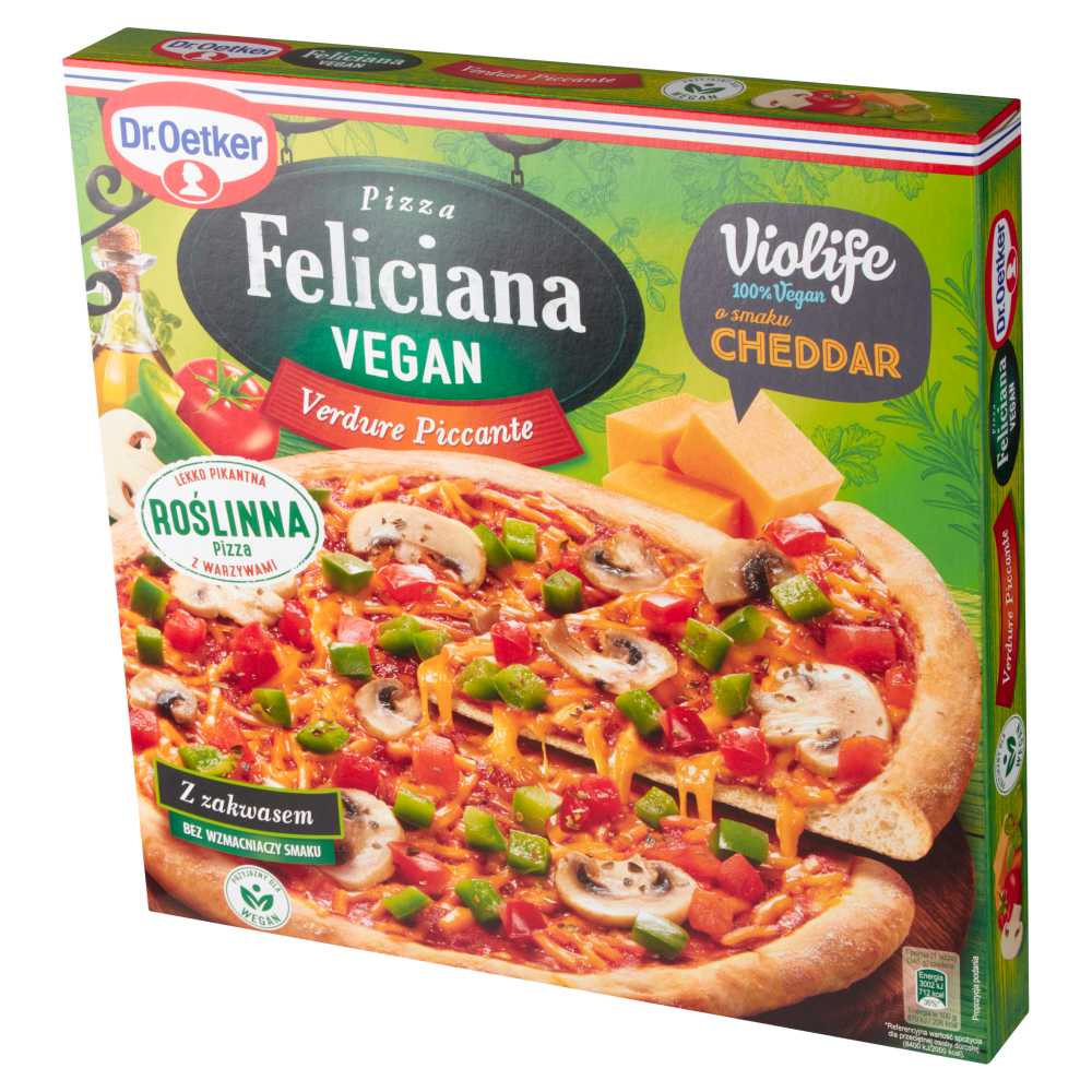 Tajemnica roślinnej pizzy Feliciana Dr. Oetkera tkwi w cienkim i chrupiącym cieście z lekko grubszymi brzegami oraz pysznych składnikach i przyprawach. To idealna pizza dla miłośników roślinnej diety.