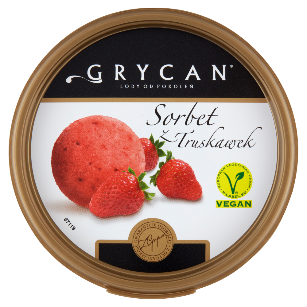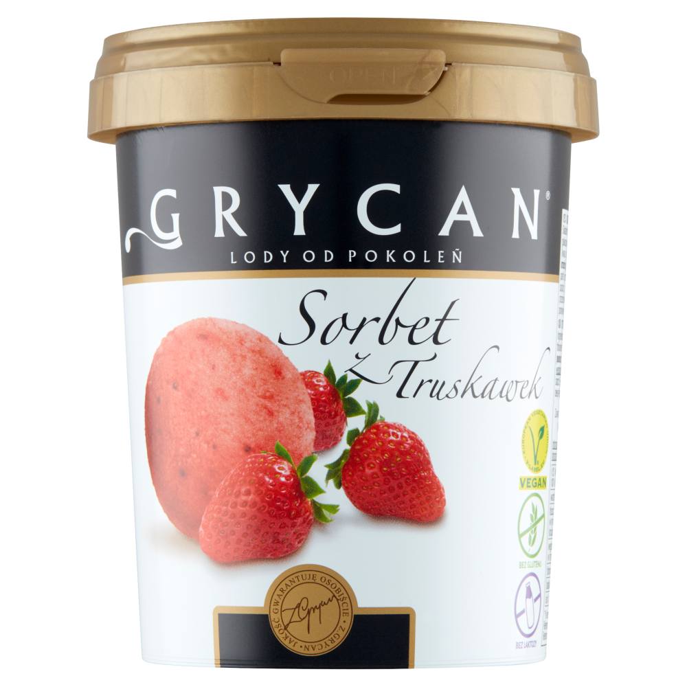 Sorbet z truskawek Grycan to orzeźwiający, mrożony deser tworzony z naturalnych składników z dbałością o najdrobniejsze szczegóły, w oparciu o tradycyjną recepturę udoskonalaną przez pokolenia rodziny cukierników. Do jego produkcji użyto ręcznie selekcjonowanych i przygotowywanych, wyśmienitych polskich truskawek. Zawartość owoców to aż 45% - teraz możesz poczuć ten wyjątkowy, świeży smak o każdej porze dnia i roku - zawsze, kiedy masz ochotę na coś naprawdę pysznego!