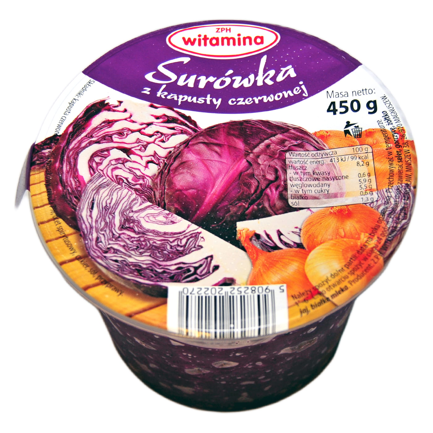 Składniki: kapusta czerwona 73%, olej rzepakowy, cebula 7%, ocet spirytusowy, cukier, sól, przyprawy.