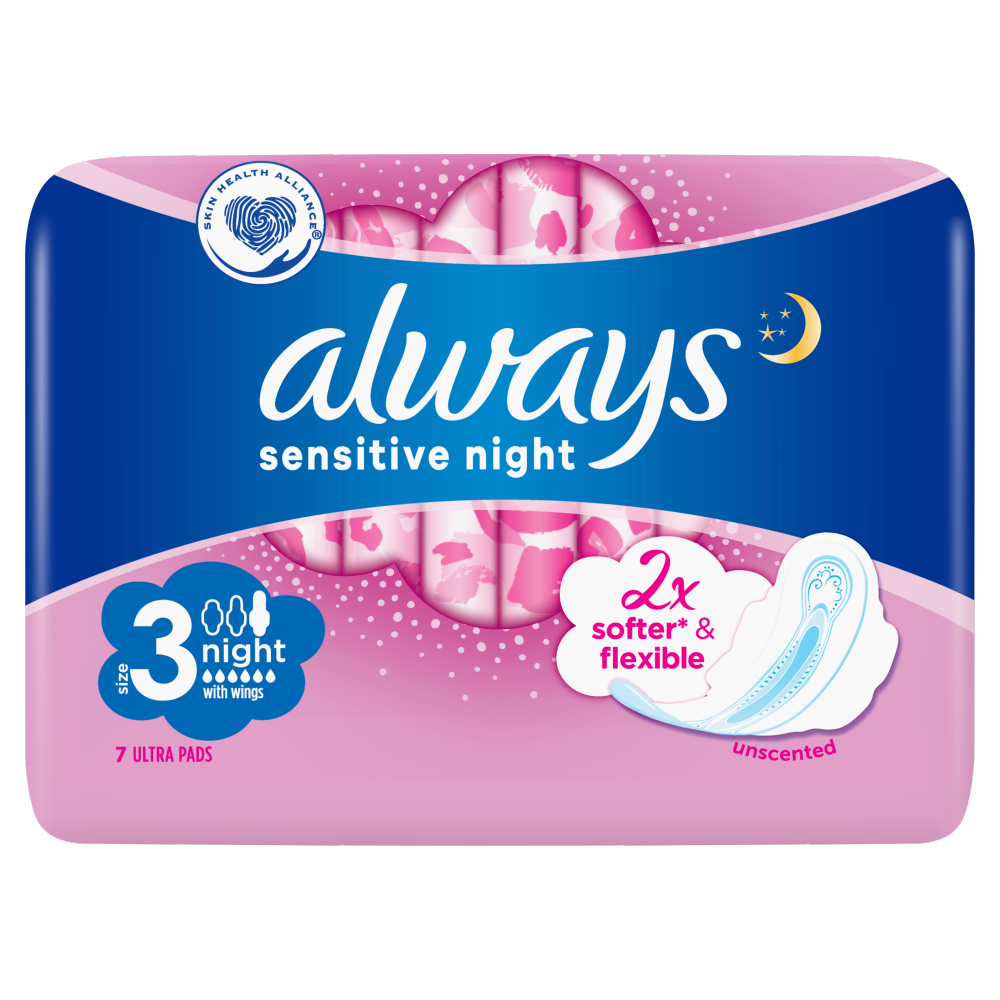 Miękka jak bawełna powłoczka oraz unikalne strefy komfortu zapewniają delikatnej skórze dodatkową wygodę przez całą noc. Doskonałe na noc i w przypadku bardzo obfitego krwawienia. Skrzydełka zapewniają dodatkową ochronę i pomagają utrzymać podpaskę na miejscu. Podpaski ze skrzydełkami Always Ultra Sensitive Night (rozmiar 3) to najlepsze z produktów Always Sensitive do stosowania na noc.