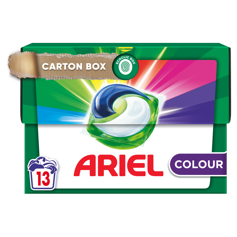 Pudełko tekturowe ECOCLIC: Ograniczmy ilość plastikowych odpadów dzięki kapsułkom do prania Ariel All-in-1 PODS, które są teraz dostępne w nadającym się do recyklingu opakowaniu tekturowym, zawierającym maksymalnie 5% tworzyw sztucznych