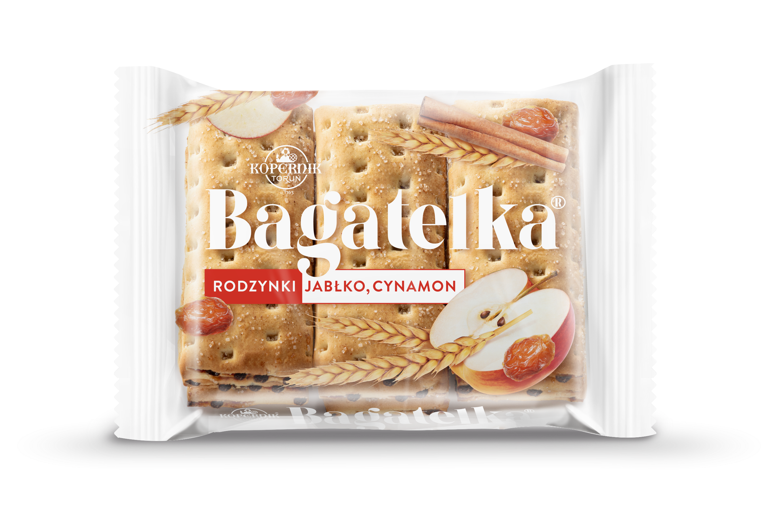 Klasyczna Bagatelka® to ciastko wypieczone jako dwa rumiane, idealnie kruche herbatniki, połączone jabłkowym nadzieniem z dodatkiem cynamonu oraz dużej ilości rodzynek