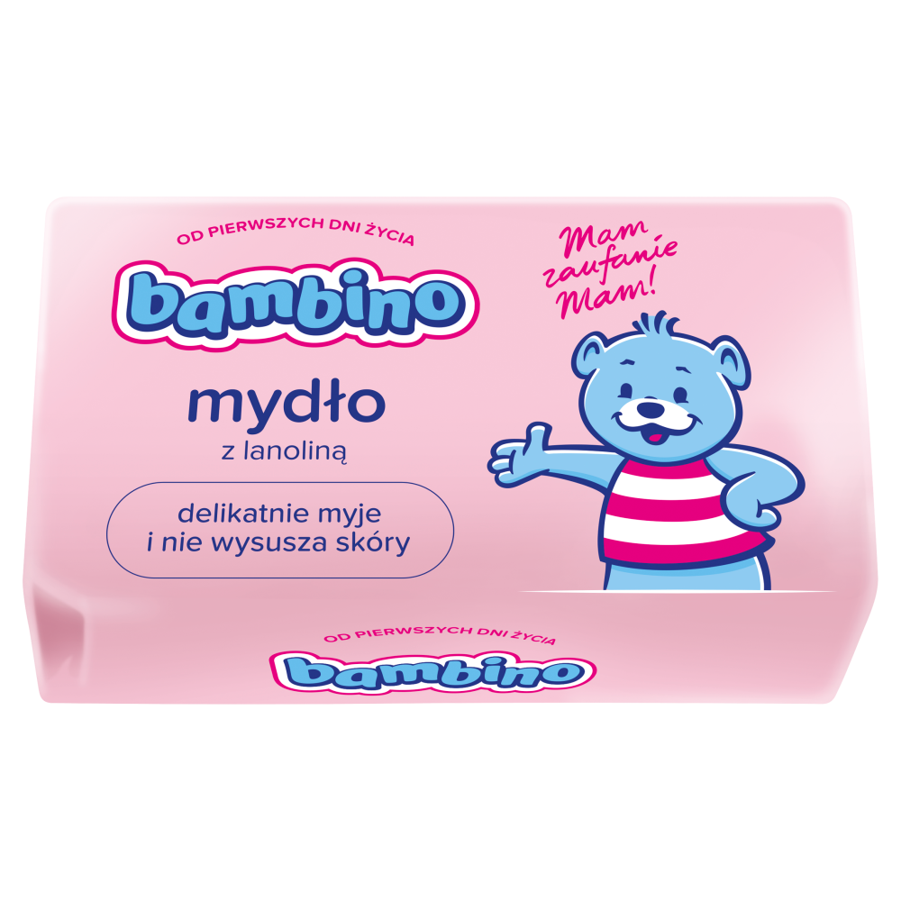 Mydło Bambino delikatnie myje i pielęgnuje skórę, dzięki zawartości lanoliny nie wysusza skóry. Polecane jest do codziennej higieny niemowląt i małych dzieci. Wszystkie kosmetyki Bambino posiadają pozytywną opinię Instytutu Matki i Dziecka oraz atest PZH.