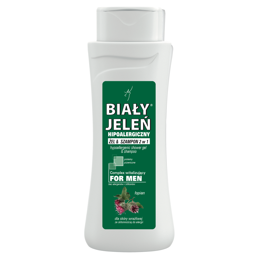 Hipoalergiczny żel & szampon Biały Jeleń 2 w 1 for Men z łopianem i proteinami pszenicznymi oczyszcza, wzmacnia i odżywia skórę oraz przywraca witalność włosom. Przeznaczony jest dla każdego rodzaju skóry oraz do włosów normalnych i przetłuszczających się. Łopian- wzmacnia cebulki włosów, działa regenerująco, tonizująco i przeciwbakteryjne, normalizuje pracę gruczołów łojowych skóry. Odżywia osłabioną i uszkodzoną strukturę włosa, stymuluje porost włosów i hamuje ich wypadanie. Proteiny pszeniczne chronią, odżywiają i nawilżają skórę.