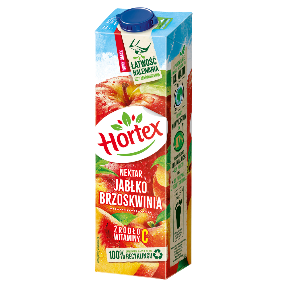 Hortex Jabłko Brzoskwinia - nektar o wyśmienitym smaku świeżych owoców: aksamitnych brzoskwiń i polskich jabłek. Wyprodukowany z wyselekcjonowanych, najlepszych owoców, które są doskonałym źródłem witaminy C. Produkt dostępny w nowym kartonie, którego kształt ułatwia nalewanie produktu - bez marnowania. Opakowanie jest bardziej przyjazne dla klimatu, ponieważ w 100 % nadaje się do recyklingu i w aż 87 % pochodzi ze źródeł odnawialnych. Zakrętka wyprodukowana z tworzywa z trzciny cukrowej