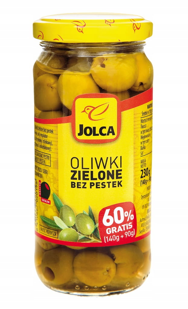 Hiszpańskie oliwki zielone bez pestek 60% GRATIS (140g + 90g) Jolca!