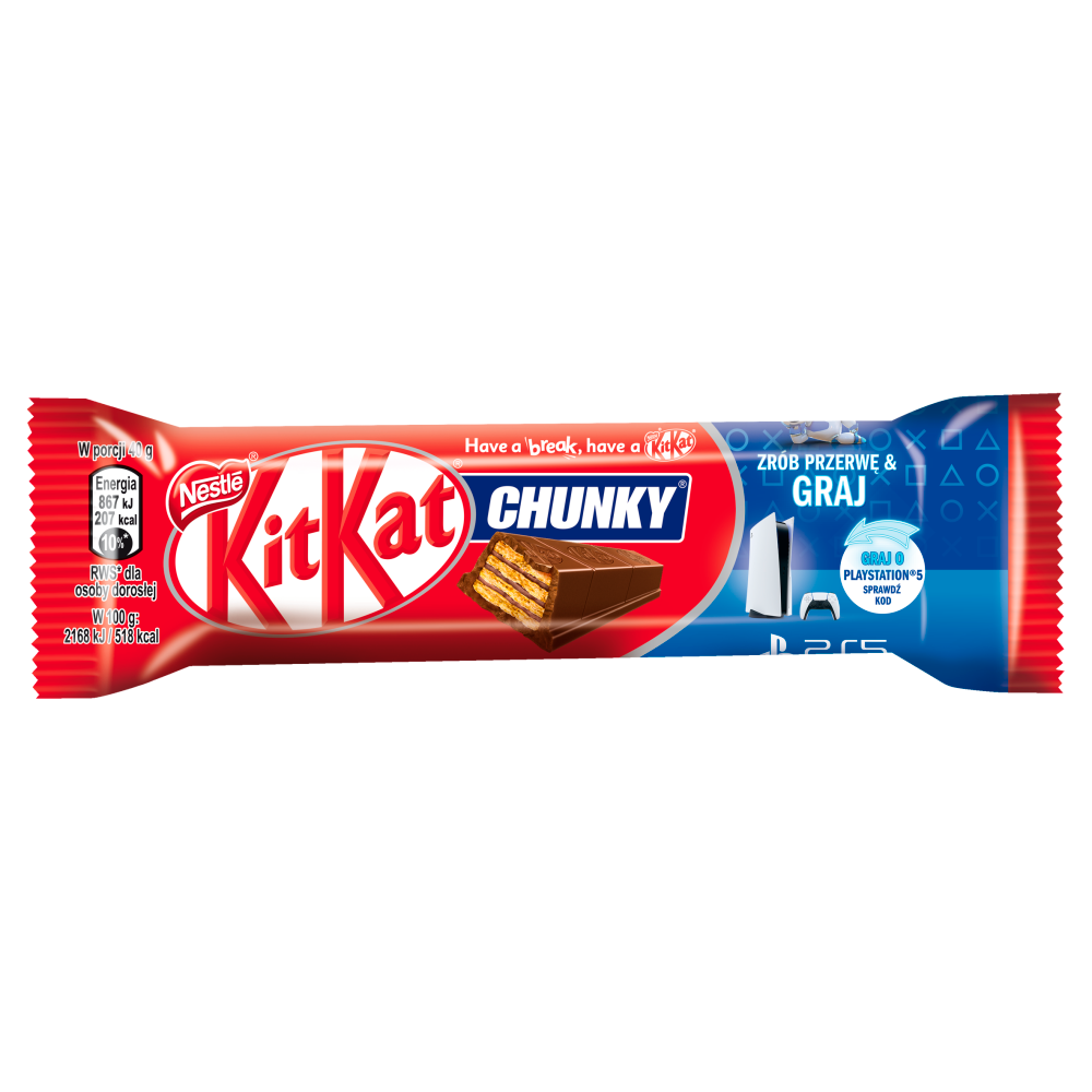 Kup baton KitKat w opakowaniu promocyjnym. Zarejestruj kod z wnętrza opakowania na www.GrajoPS5.pl i od razu sprawdź, czy wygrałeś PlayStation 5. Weź udział w loterii od 3.08 do 30.09.2021 r. Zachowaj zgłoszone opakowania promocyjne. Szczegóły i regulamin loterii: www.GrajoPS5.pl
