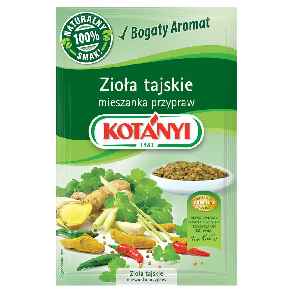 Zioła tajskie to intrygująca kompozycja przypraw z dodatkiem ziół azjatyckich, charakterystyczna dla kuchni tego kraju. Wyraźny aromat mieszanki Kotányi nada Państwa potrawom nutę wyjątkowego smaku typowego dla kuchni tajskiej.