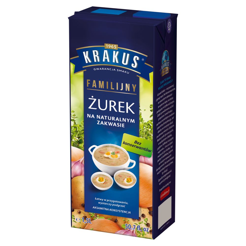 A żurek Krakus - na pszennej i żytniej mące, bez konserwantów, na naturalnym zakwasie - to wyborna zupa, na którą zasługujesz nie tylko od święta. Dzięki sprawdzonemu od lat przepisowi, żurek Krakus zachwyca wyrazistym smakiem i aksamitną konsystencją. Jest idealny na uroczysty obiad i na domowy wieczór z bliskimi. Możesz podać go uroczyście, w wydrążonym chlebku, z jajkiem, kiełbasą i szczyptą majeranku... A na co dzień możesz pić go z kubka, bez żadnych dodatków, jedynie ze świeżym razowcem do zagryzania. Bo żurek Krakus nie potrzebuje towarzystwa, by cieszyć.