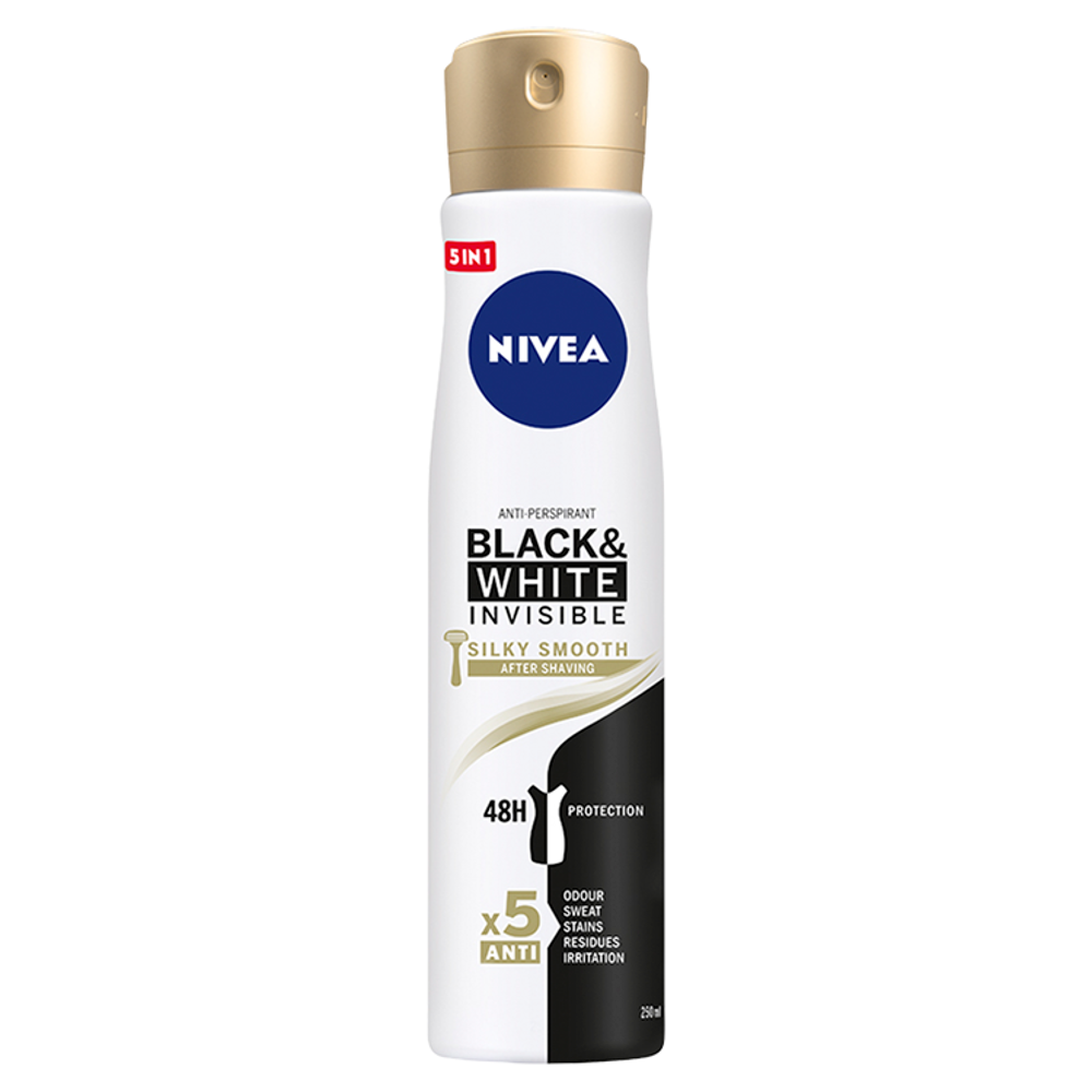 NIVEA Antyperspirant Black&White Invisible Silky Smooth spray to produkt, który zapewni Ci skuteczną i niezawodną ochronę przed poceniem się, bez ryzyka pobrudzenia ubrań. Zapewnia ochronę 5w1 i chroni przed nieprzyjemnym zapachem, poceniem, plamami i śladami na ubraniach oraz przed podrażnieniami. Pozostawia uczucie jedwabiście gładkiej i miękkiej skóry, nawet przy codziennym goleniu lub depilacji. Unikalna formuła chroni Cię przed nadmiernym poceniem się przez 48 godzin i pomaga zachować pierwotny kolor ubrań.
