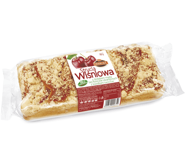 Mąka pszenna, nadzienie (wiśnia mrożona 16,0%, przecier jabłkowy, cukier, skrobia modyfikowana, przecier śliwkowy, przecier aroniowy, przecier wiśniowy 0,3%, pektyny - substancja żelująca, kwas cytrynowy - regulator kwasowości), cukier, olej rzepakowy, jaja, serwatka w proszku (z mleka), masło 1%, drożdże, sól, woda, karoteny - barwnik, aromat.