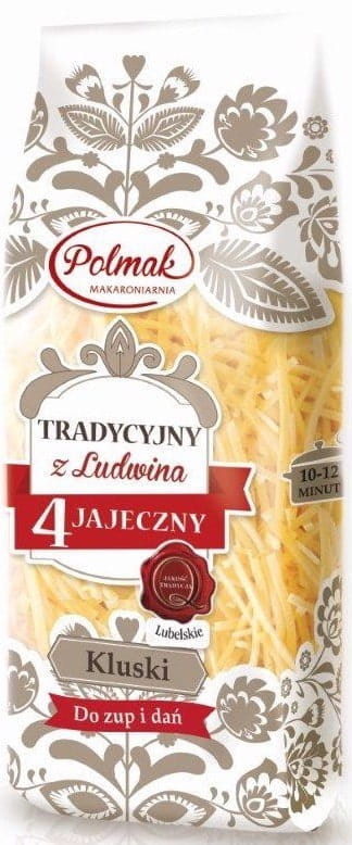Polmak Makaron Tradycyjny 4-jajeczny kluski Kluski to najchętniej wybierany makaron spośród linii makaronów tradycyjnych firmy Polmak. Jest on produkowany w oparciu o dawną, sprawdzoną recepturę. Tak jak nasze babcie i mamy, wytwarzając ciasto dodajemy 4 jaja na 1 kg mąki pszennej. Nasz sposób produkcji, niezmienny od 50 lat został potwierdzony certyfikatem Jakość Tradycja. Kluski firmy Polmak to niezastąpiony składnik tradycyjnych polskich zup jak rosół czy pomidorowa. Doskonale sprawdzą się również jako składnik dań dla dzieci.