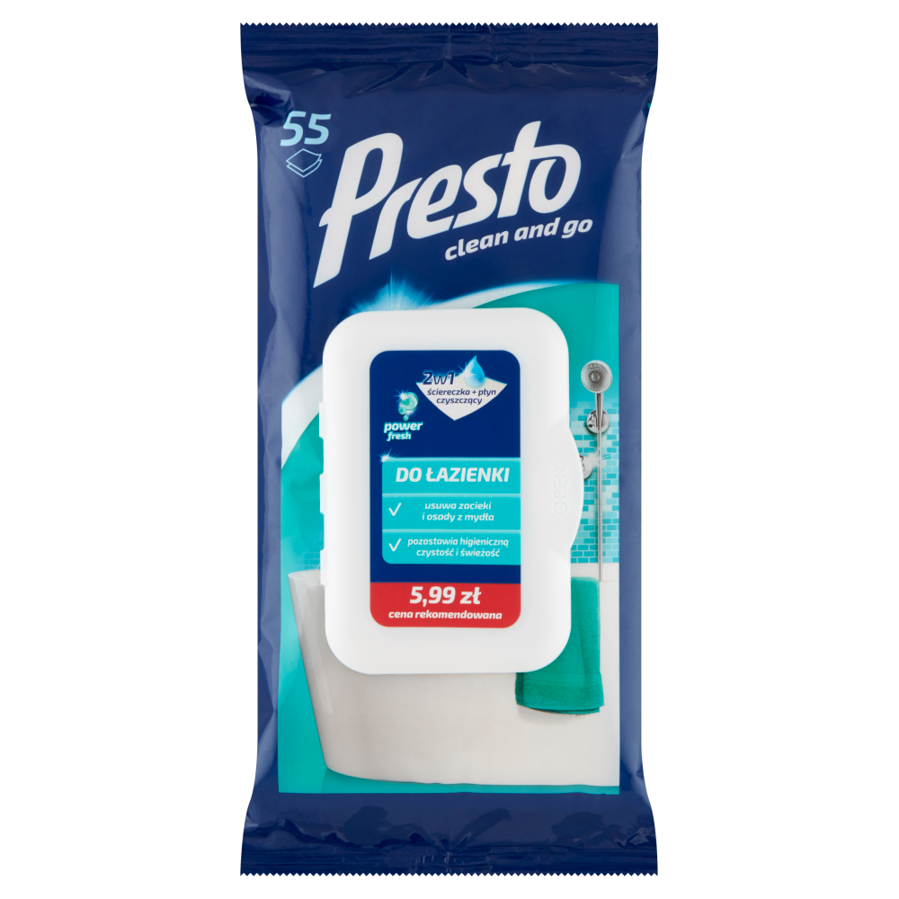 Ściereczki nawilżane Presto do łazienki usuwają zacieki i osady z mydła, pozostawiają higieniczną czystość i świeżość.