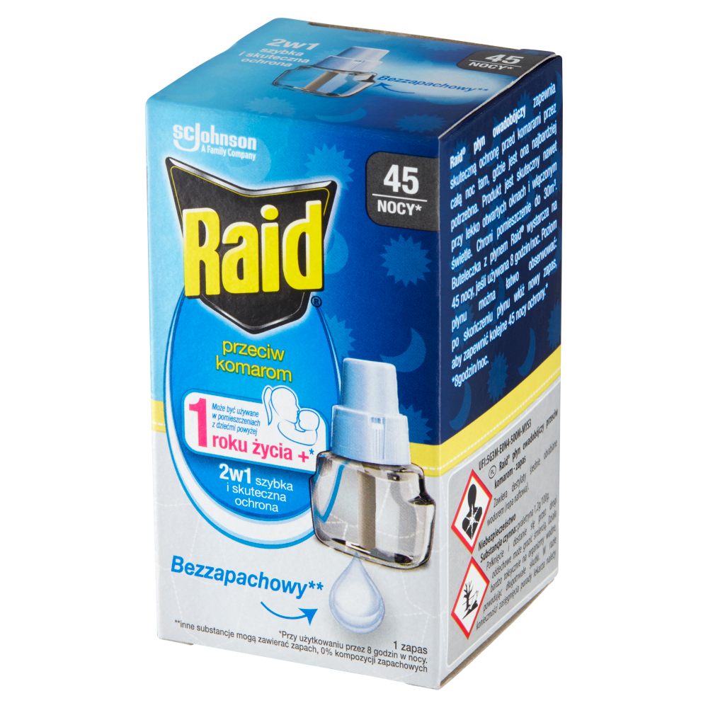 Raid płyn owadobójczy zapewnia skuteczną ochronę przed komarami przez całą noc tam, gdzie jest ona najbardziej potrzebna. Produkt jest skuteczny nawet przy lekko otwartych oknach i włączonym świetle. Chroni pomieszczenie do 30m3. Buteleczka z płynem Raid wystarcza na 45 nocy, jeśli używana 8 godzin/noc. Poziom płynu można łatwo obserwować: po skończeniu płynu włóż nowy zapas, aby zapewnić kolejne 45 nocy ochrony.*