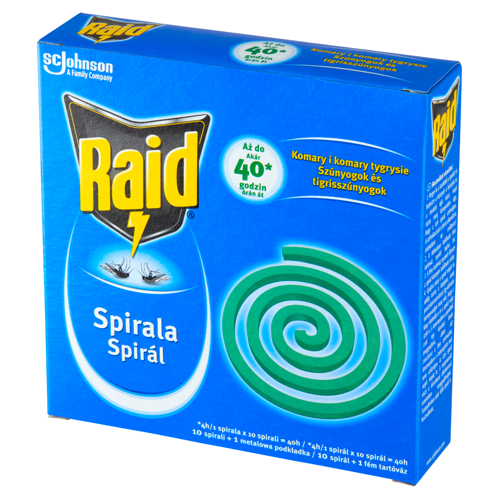 Działa po 1,5 h od zastosowania. Do stosowania na zewnątrz jedynie do zwalczania owadów. Raid jest przeznaczony do stosowania w miejscach odpoczynku na wolnym powietrzu takich jak ogrody, balkony, patia. Tylko do użytku na wolnym powietrzu. Działanie przeciw komarom dla 1 spirali trwa przez 4 godziny w zależności od warunków atmosferycznych np. wiatr, deszcz.