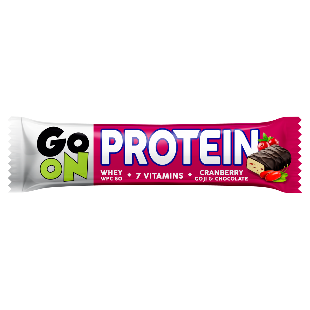 Proteinowy baton z żurawiną i jagodami goji w czekoladzie deserowej, wzbogacony witaminami.