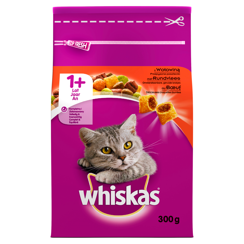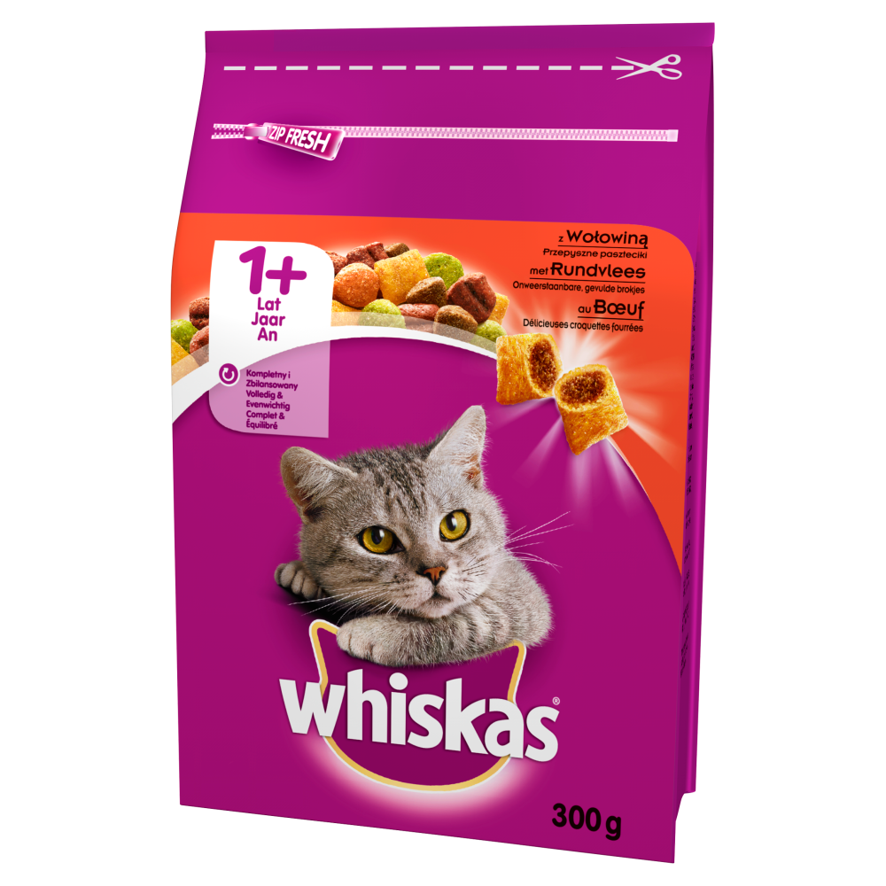 Whiskas wie, co kocha Twój kot i czego naturalnie potrzebuje, Sucha karma Whiskas 1+ to kompletny i zbilansowany pokarm, z witaminami i minerałami, stworzony by Twój kot żył długo, zdrowo i szczęśliwie.