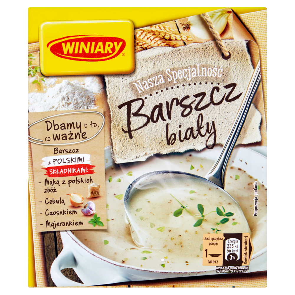 Winiary Barszcz biały Nasza Specjalność to tradycyjnie polska zupa o lekko kremowej konsystencji, kwaskowatym smaku, z dodatkiem przypraw takich jak majeranek, czosnek i cebula.