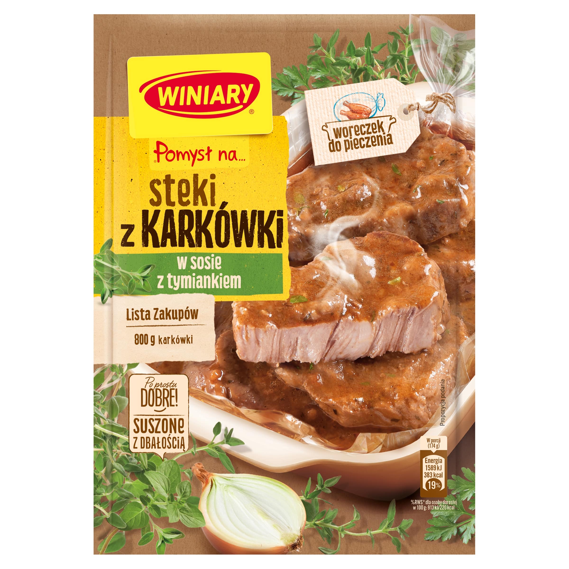 Winiary Pomysł Na…Steki z karkówki w sosie z tymiankiem to propozycja na urozmaicenie codziennej kuchni. Gęsty i aromatyczny sos przyrządzisz już w woreczku razem z soczystym i kruchym mięsem.